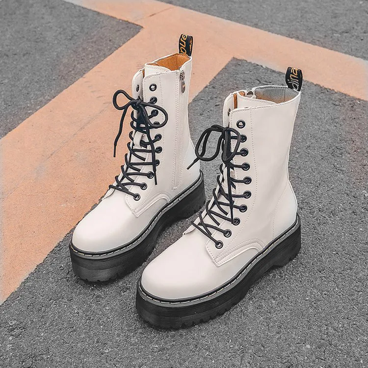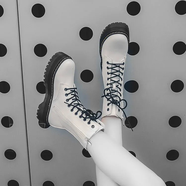 Fashion Zipper Flat Shoes Woman High Heel Platform PU Leather Boots Lace Up Women Shoes White Milit